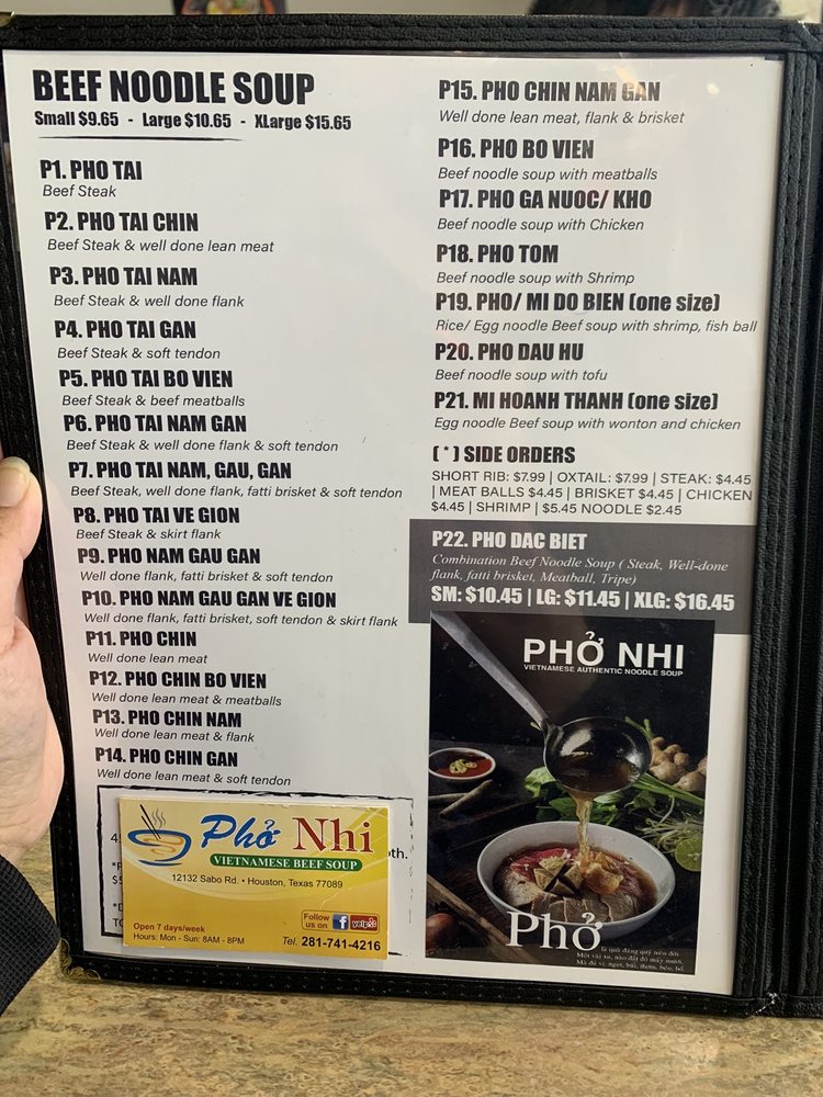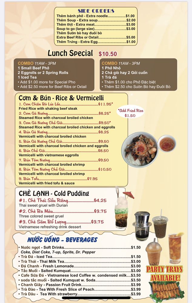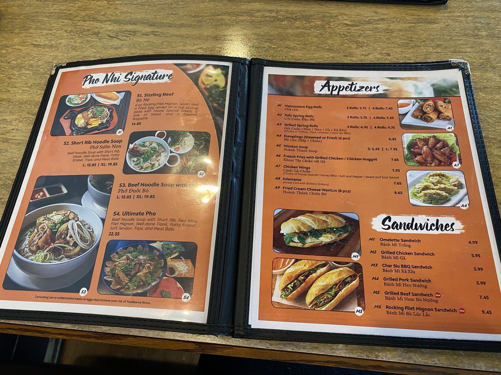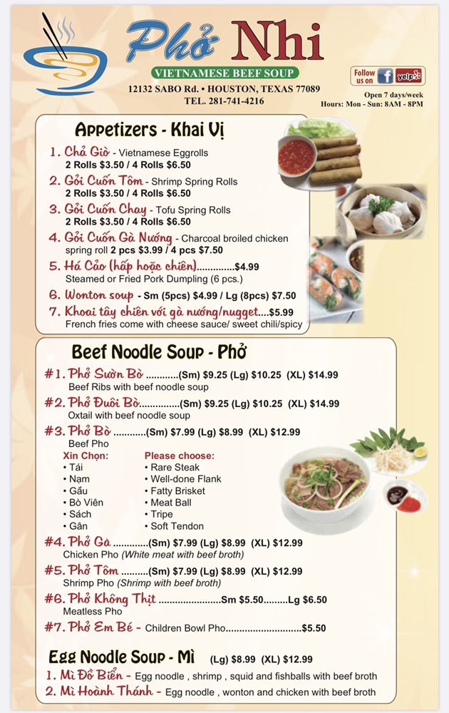Introducing Pho Nhi, a Vietnamese soup haven located in Houston, TX. The menu offers an array of delectable appetizers like Vietnamese Egg Rolls and Charcoal Broiled Chicken Spring Rolls. But the star of the show is their Beef Noodle Soup, featuring savory broth and beef ribs in various sizes. Seafood Egg Noodle Soup and Wonton Egg Noodle Soup provide tasty alternatives. Customers rave about the rich and flavorful pho, highlighting the impeccable service and inviting ambiance. With a diverse selection of dishes, including vegetarian options and catering services, Pho Nhi is a must-visit for food enthusiasts. Don't miss out on their happy hour specials and unique drinks like lychee fruit and jelly concoctions. Experience the best of Vietnamese cuisine at Pho Nhi, where every bite is a delight.